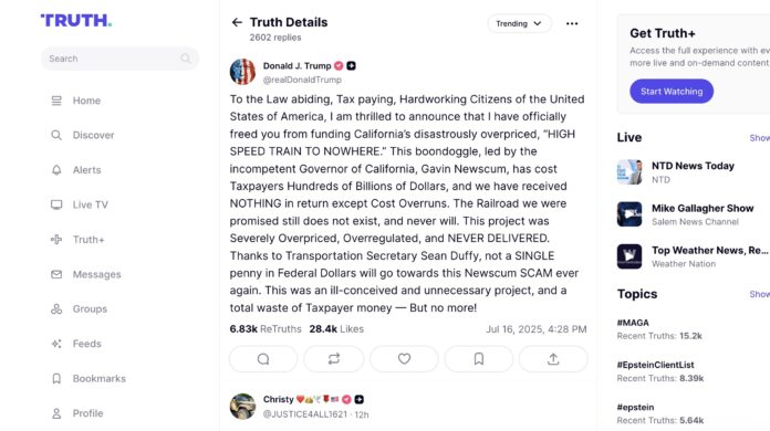 总统特朗普7月16日通过社交媒体平台 Truth Social表示,将不再拨付联邦资金支持加州高铁项目 。美国人无需再为加州灾难般高价的“无处可去的高速列车”提供资金。特朗普表示,这个项目,已经花费了纳税人数千亿美元,