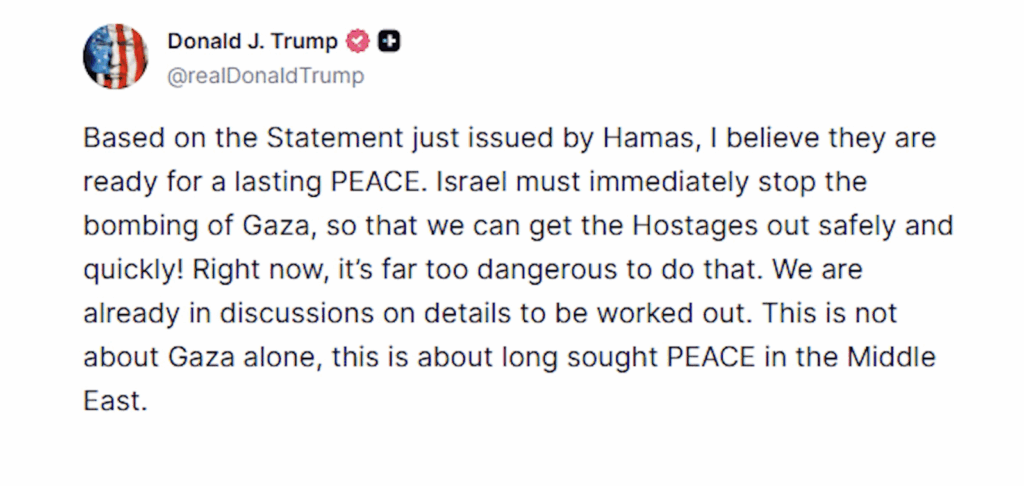 特朗普在社交媒体上写道:“以色列必须立即停止对加沙的轰炸,这样我们才能安全、迅速地救出人质!目前局势太危险。我们已经在讨论下一步的细节。”
