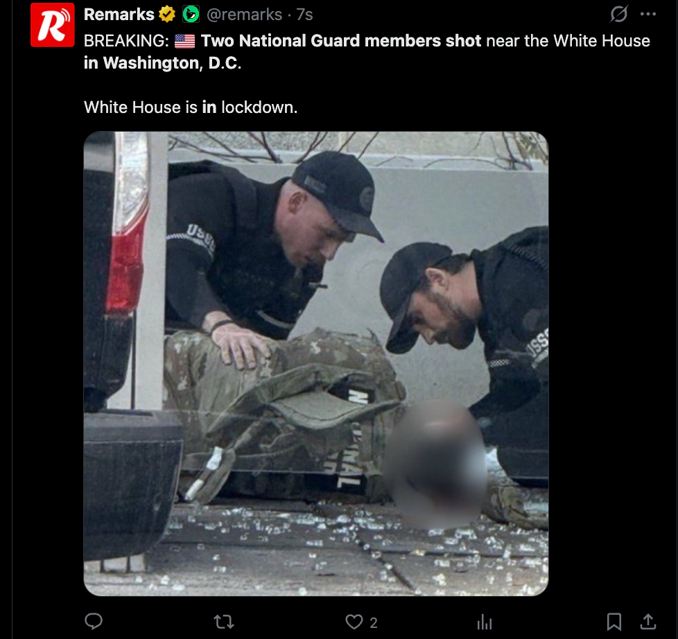 据两名未被授权公开讨论此事的执法官员透露,两名国民警卫队士兵周三在白宫附近被枪杀,目前情况尚不清楚。