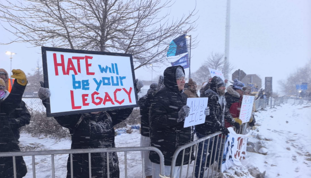 在位于明尼苏达州明尼阿波利斯外 亨利·惠普尔联邦大楼(Bishop Henry Whipple Federal Building) 也是美国移民和海关执法局(ICE)行动的集结设施前,仍聚集数十名反对联邦移民执法行动的抗议人士, 不少人在寒风中,手举让ICE离开标语,表达对联邦执法人员到来的不满,每当有车辆从联邦大楼开出时,他们就举起标语,呼喊口号。