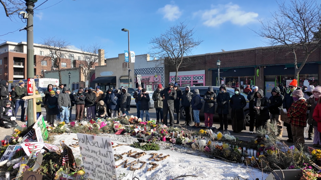 25号当天,上百人聚焦在美国公民Alex Pretti过世的事发现场,不少人带着鲜花前来悼念