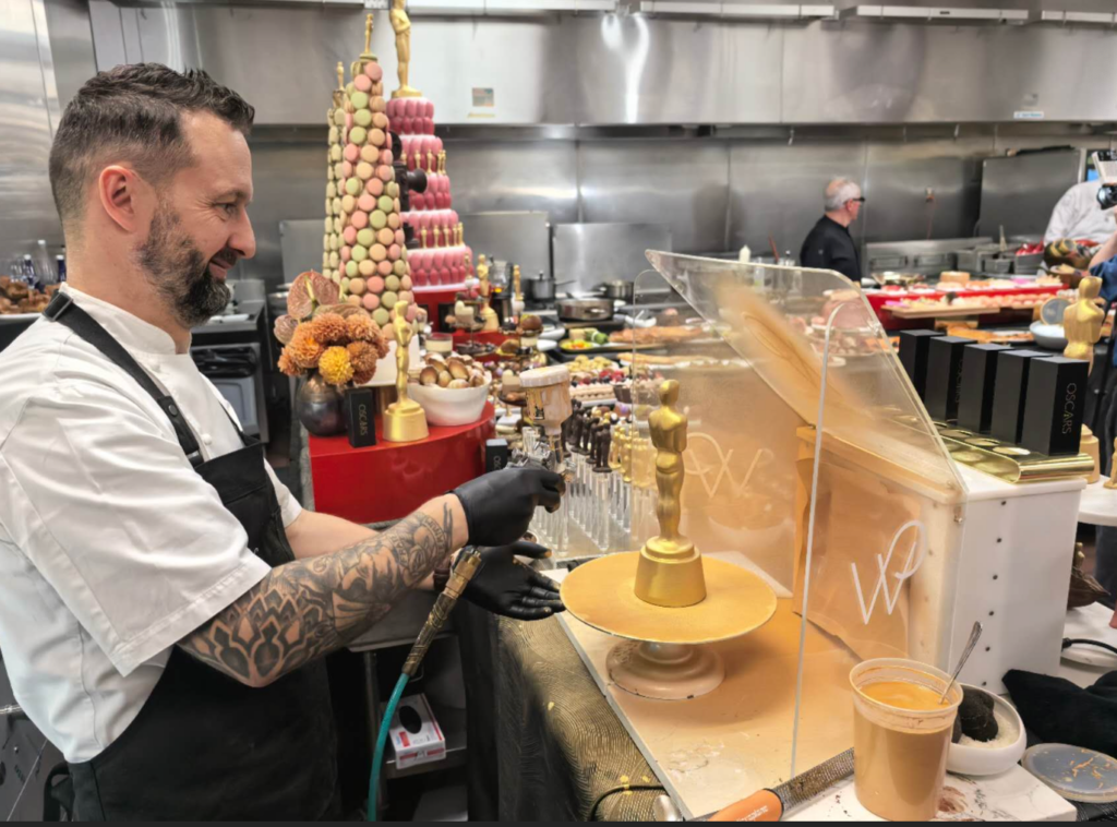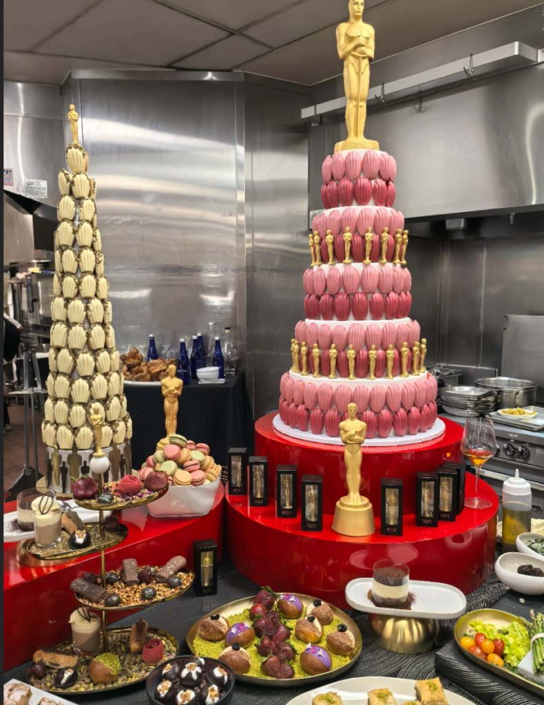 今年的晚宴由世界著名厨师帕克( Wolfgang Puck )负责餐饮,他已经连续 32年 为奥斯卡晚宴设计菜单。今年的团队规模非常庞大,包括约 75名热菜厨师、45名甜点厨师、300多名服务人员