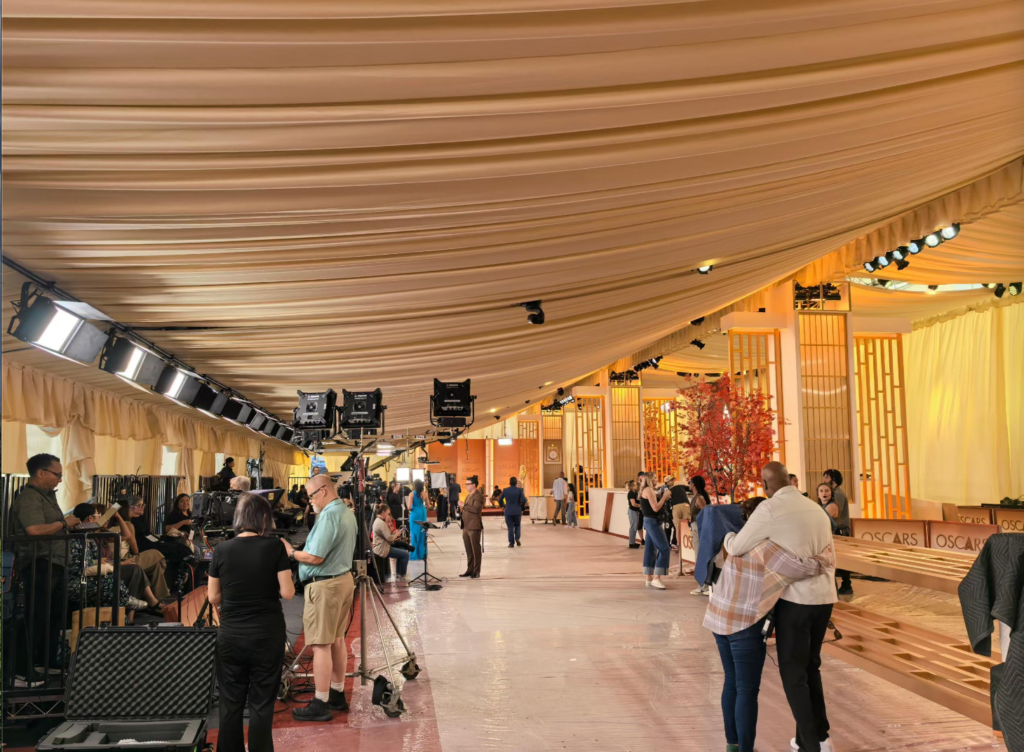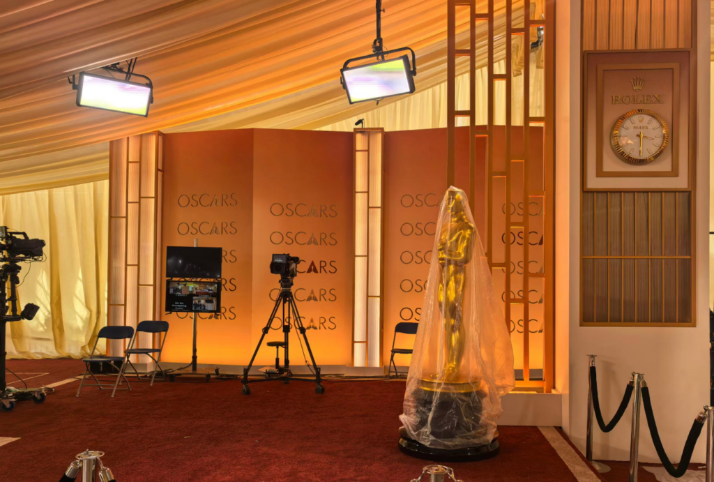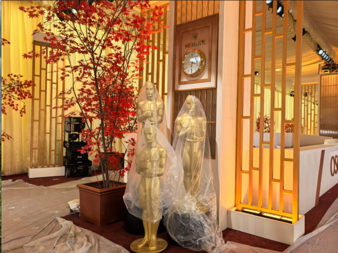 奥斯卡颁奖典礼即将登场,目前各项准备工作仍在有条不紊地进行。今年舞台布置的一大特点,是一改往年以大红为主的传统主题色,整体视觉转为更加冷艳、高贵的香槟色调。现场还摆放了大量人造植物装饰,营造出一种带有东方禅意的氛围。
